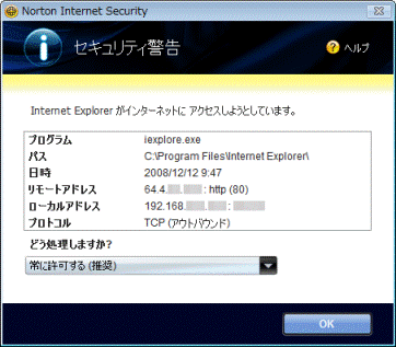 パソコン内のプログラムが初めてインターネットへアクセスしようとしたときに、Norton Internet Securityが安全かどうかを判断します。