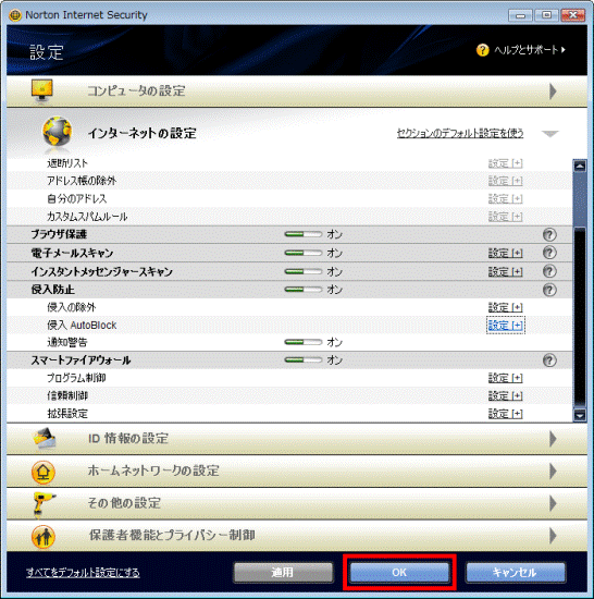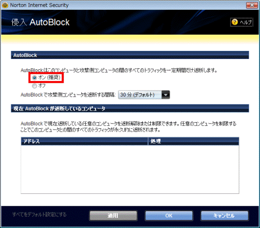 Norton Internet Security 2009で、侵入防止を設定する方法は、次のとおりです。