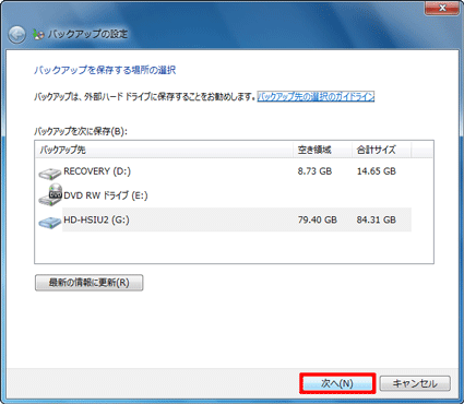 - 「バックアップを保存する場所の選択」と表示されます。