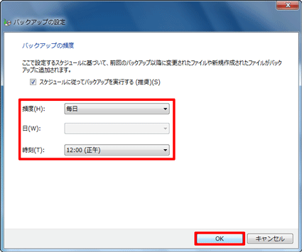 - 「頻度」、「日」、「時刻」を変更し、「OK」ボタンをクリックします。
