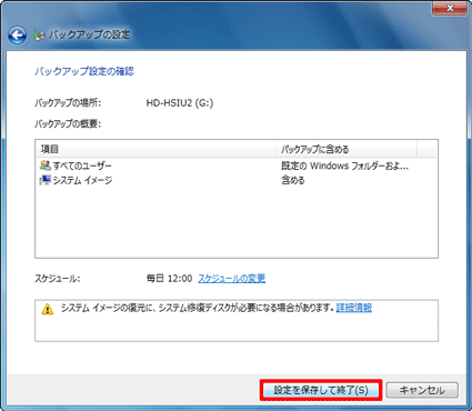 - 「バックアップ設定の確認」と表示されます。