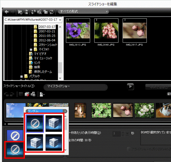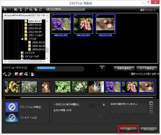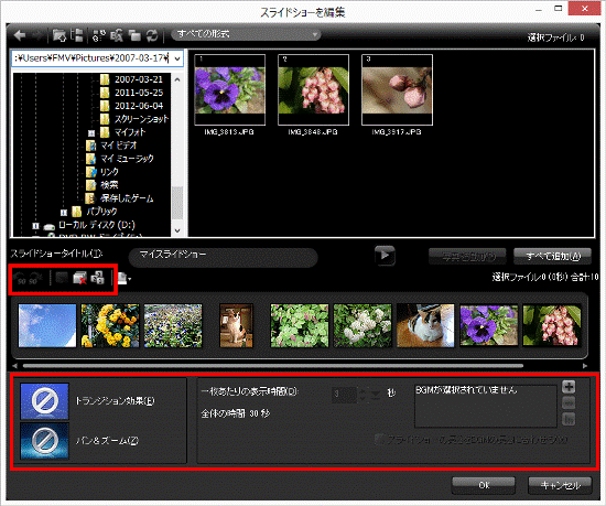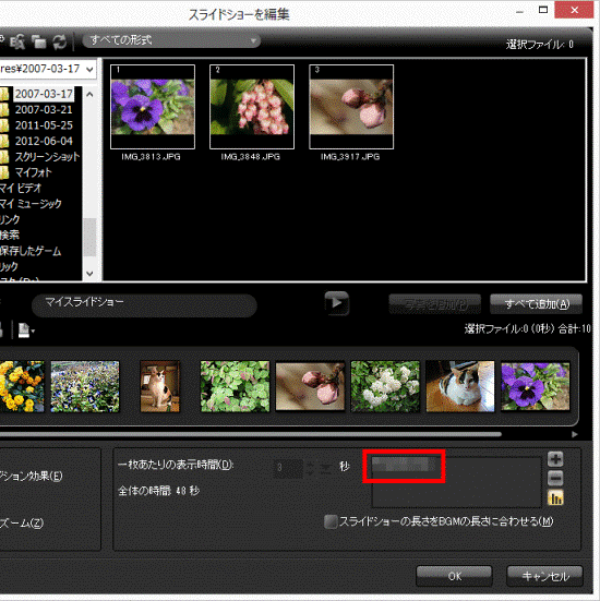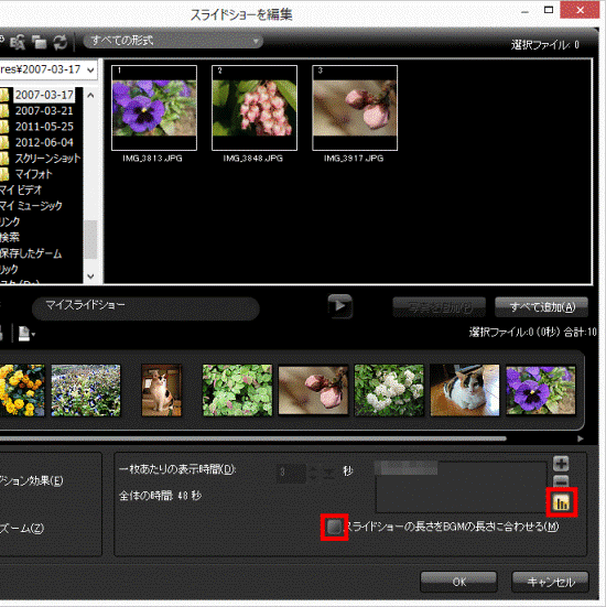 - 画面下部の「スライドショーの長さをBGMの長さに合わせる」をクリックしチェックを付けると、BGMの再生時間に合わせてスライドショーの表示が調整されます。