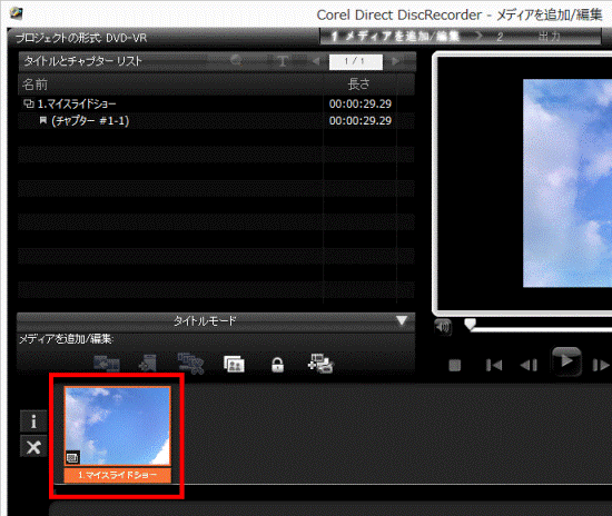 Corel Direct DiscRecorderで、スライドショーを作成できるのは、DVD-VR形式のみです。