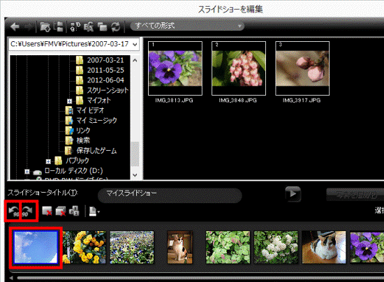 回転させたい写真をクリックし、矢印と「90」が描かれた「左に回転」ボタン、または「右に回転」ボタンをクリックして向きを選択すると、写真が回転します。