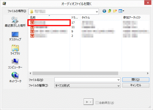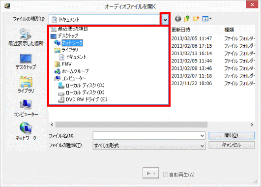 」ボタンまたは「▼」ボタンをクリックし、表示される一覧から、設定するBGMが保存されているフォルダーをクリックします。