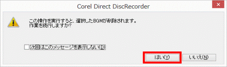 「この操作を実行すると、選択したBGMが削除されます。」と表示されたら、「はい」ボタンをクリックすると、BGMが削除されます。