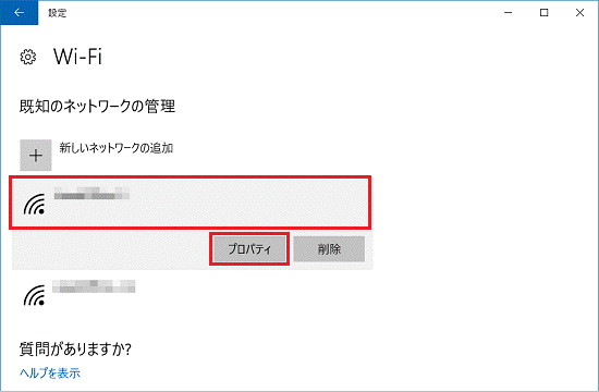 表示されたネットワークの一覧から、従量制課金接続に設定するネットワークをクリックし、「プロパティ」ボタンをクリックします。