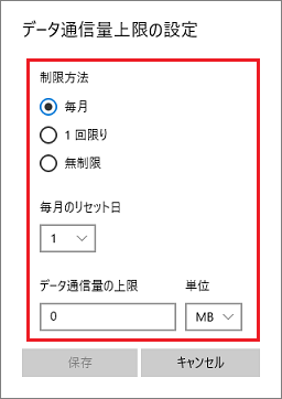 アドバイス- 「データ通信量の上限」の単位は「MB」または「GB」から選択できます。