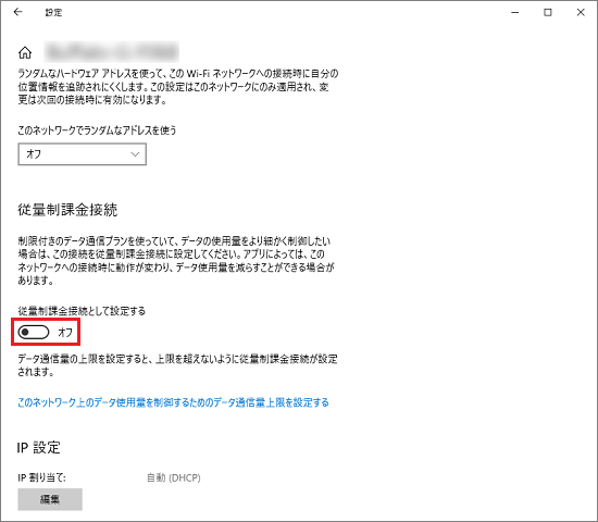 - 手順3.〜手順5.を繰り返して、「従量制課金接続として設定する」のスイッチをクリックして「オフ」にします。