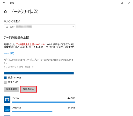 - データ通信量上限の設定を削除するネットワークの「データ使用状況」ボタンをクリックします。