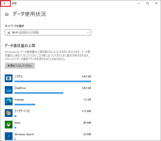 - データ通信量上限を設定する場合は、左上にある「←」ボタンをクリックします。