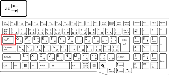 - 画面の右下にある「電源」ボタンに枠が付くまで【Tab】キーを何度か押して、【Enter】キーを押します。