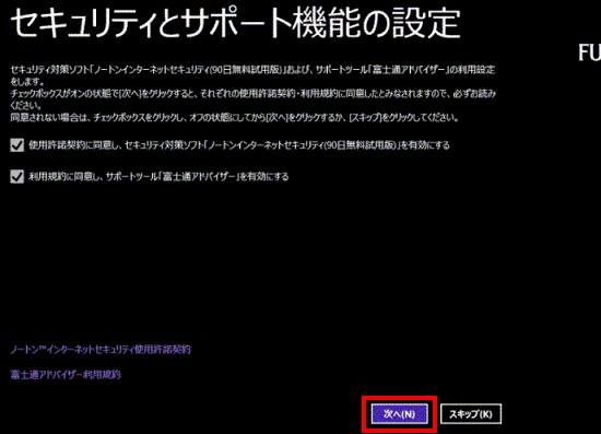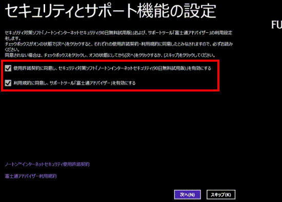 セキュリティ対策ソフトの使用許諾契約と、「富士通アドバイザー利用規約」をそれぞれクリックし、内容をよく確認します。