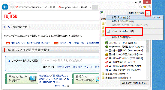 - 「お気に入りに追加」ボタンの右側にある「▼」ボタンをクリックし、表示されるメニューから「インポートとエクスポート」をクリックします。