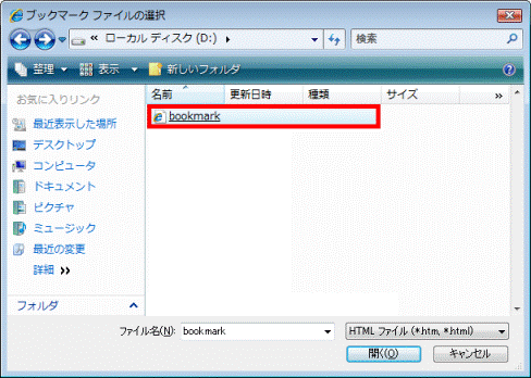 ここでは例として、「bookmark」と名前を付けて「ローカルディスク (D:)」にエクスポートした「お気に入り」をインポートします。