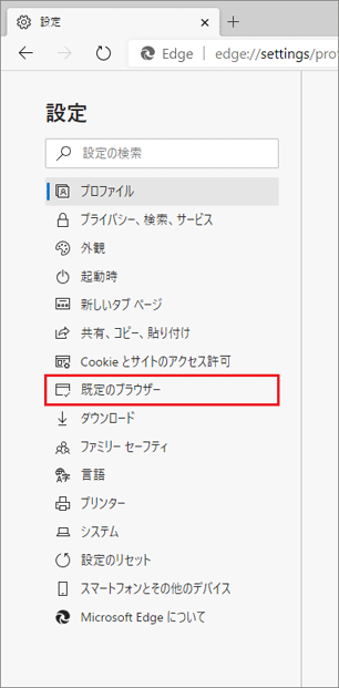 アドバイス「既定のブラウザー」が表示されていない場合は、「設定」の左にある「