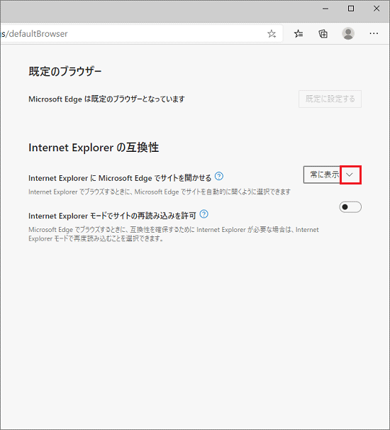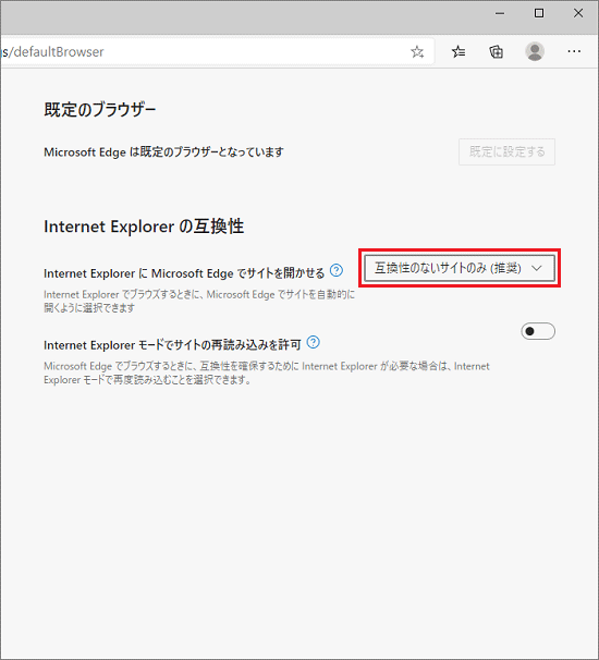 」(menu)→「既定のブラウザー」の順にクリックします。 - 「Internet Explorer に Microsoft Edge でサイトを開かせる」の「