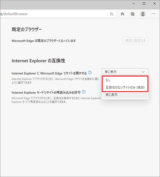 Internet ExplorerでInternet Explorerに対応していないホームページを表示したときにのみ、Microsoft Edgeが自動的に起動するようにします。 - なし