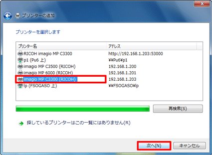 目的のプリンターを選択し、「次へ」ボタンをクリックします。
