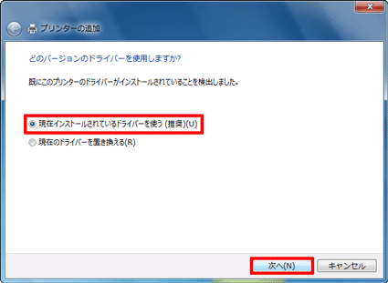 - 「現在インストールされているドライバーを使う」をクリックし、「次へ」ボタンをクリックします。