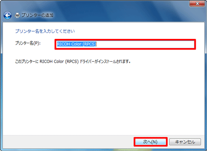 - プリンター名を入力して「次へ」ボタンをクリックします。