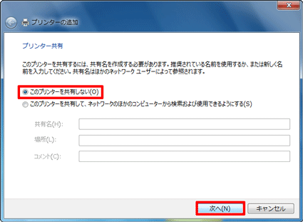 - 追加するプリンターをほかのネットワークユーザーと共有するかどうか選択して、「次へ」ボタンをクリックします。