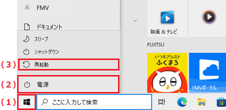 「スタート」ボタン→「電源」→「再起動」の順にクリックし、パソコンを再起動してください。