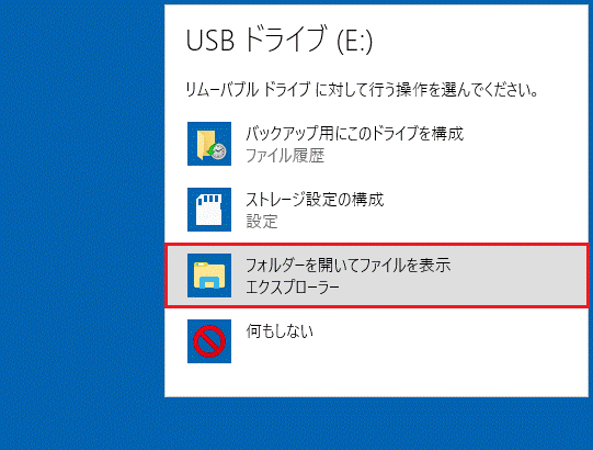 ここで「フォルダーを開いてファイルを表示」をクリックすると、USBメモリ / SDメモリーカードの内容が表示されます。