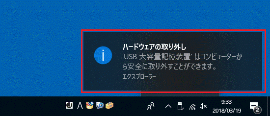 その場合は、USBメモリ、またはSDメモリカードをそのまま取り外してください。 - 「(メディア名)はコンピューターから安全に取り外すことができます。」と表示されます。