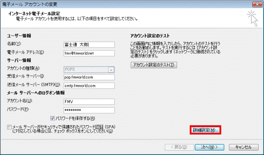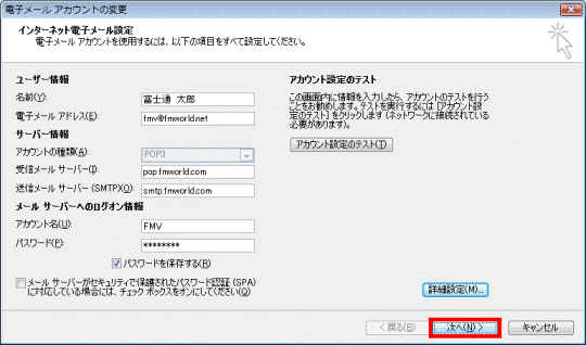 - 「電子メールアカウントの変更」の「次へ」ボタンをクリックします。