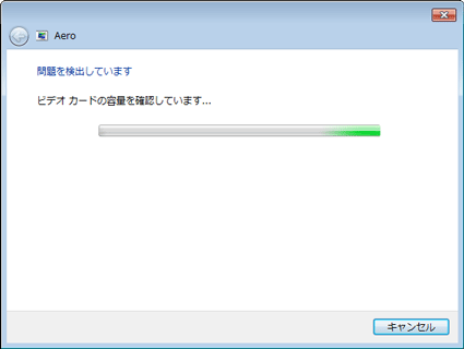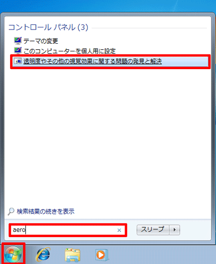 - スタートメニューの検索ボックスに「Aero」と入力し、検索結果から「透明度やその他の視覚効果に関する問題の発見と解決」をクリックします。