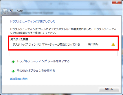 「見つかった問題」欄に表示された内容を確認します。 - 「トラブルシューティングを終了する」をクリックします。