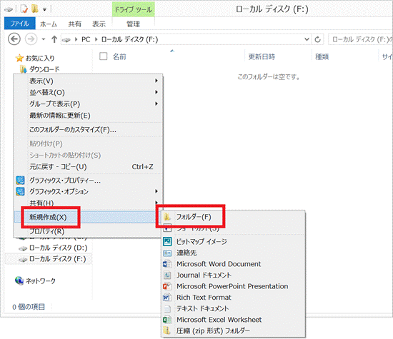- ウィンドウの何もないところを右クリックし、表示されるメニューから「新規作成」→「フォルダー」の順にクリックします。