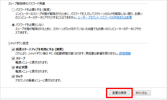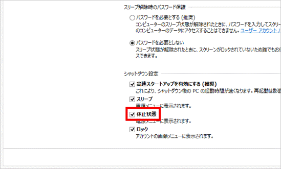 - 「シャットダウン設定」の「休止状態」をクリックし、チェックを付けます。