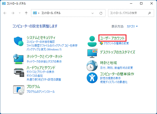 アドバイス表示方法が「大きいアイコン」または「小さいアイコン」の場合は、「ユーザーアカウント」をクリックし、手順5.に進みます。