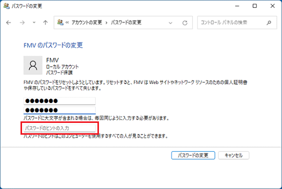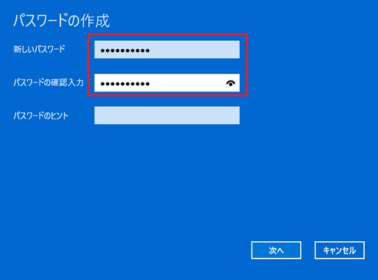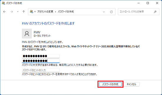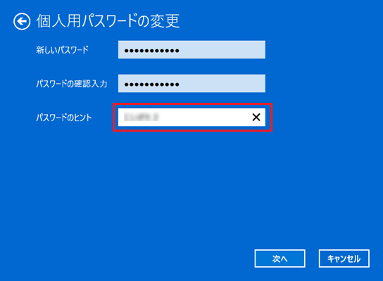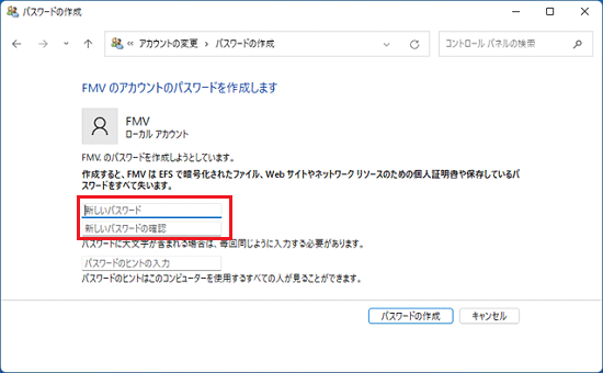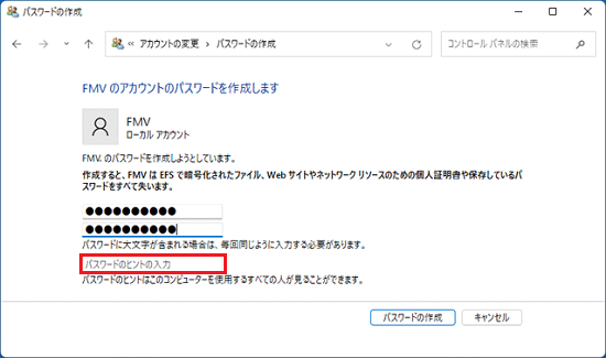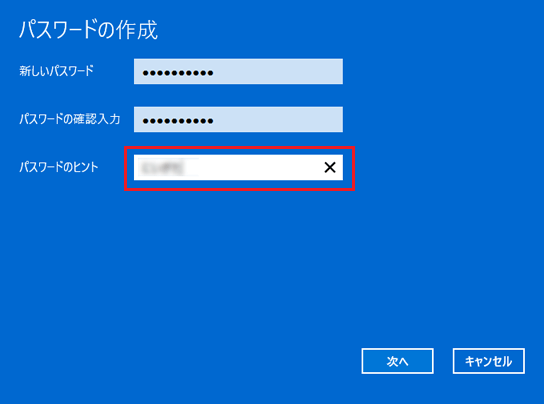 - 「パスワードのヒントの入力」には、パスワードを忘れてしまったときのために、パスワードを思い出すためのヒントを入力できます。