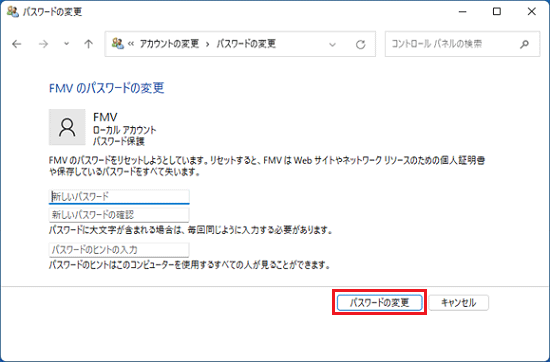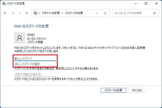 「新しいパスワード」、「新しいパスワードの確認」、および「パスワードのヒント」に何も入力されていないことを確認します。