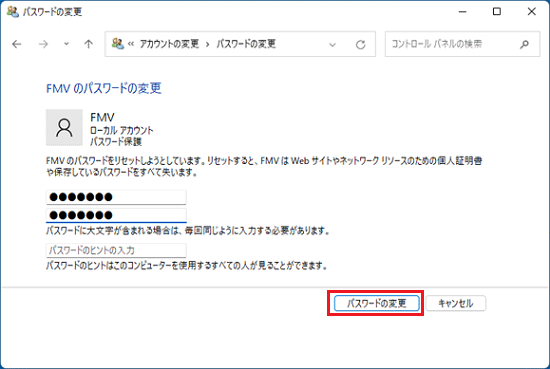 - 「新しいパスワード」欄と「パスワードの確認入力」欄に、ユーザーアカウントに変更するパスワードを入力します。