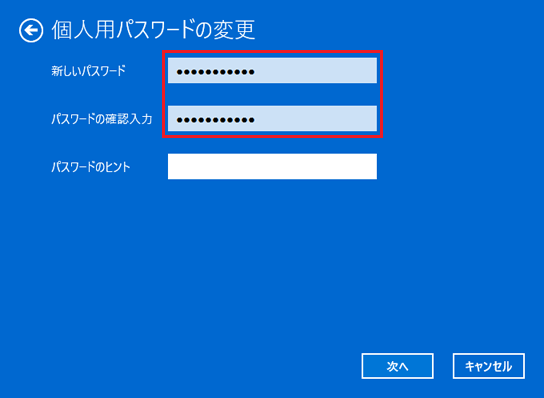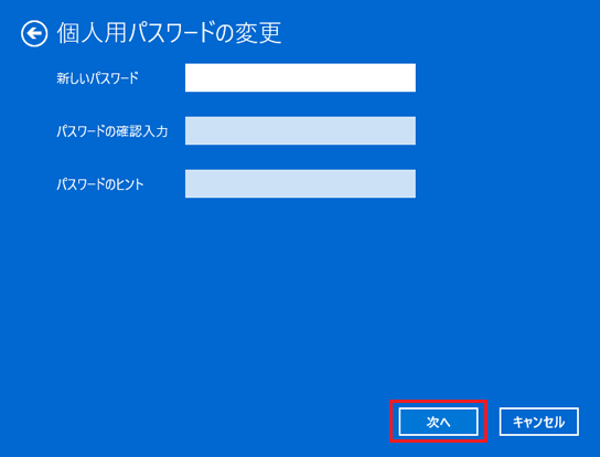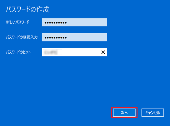- 「新しいパスワード」、「パスワードの確認入力」、「パスワードのヒント」に何も入力しないで「次へ」ボタンをクリックします。