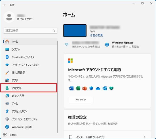 パスワードを設定するアカウントに「ローカルアカウント」と表示されていることを確認し、アカウントの項目をクリックします。