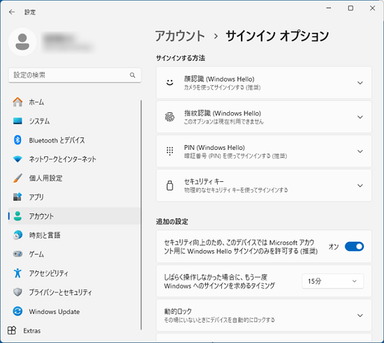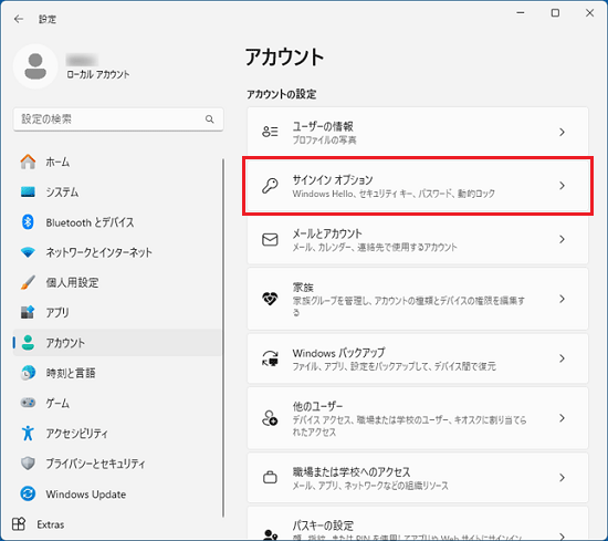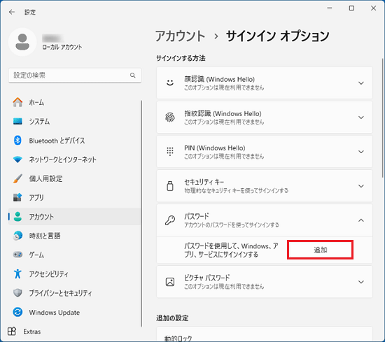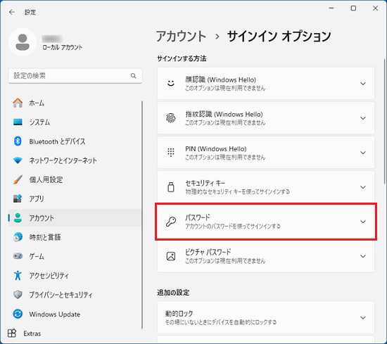 ローカルアカウントにパスワードを設定、変更、削除するのは、「サインインオプション」で行います。