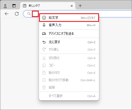 - Microsoft Edgeでは、文字が入力できる場所を右クリック→「絵文字」をクリックすることで、絵文字パネルを呼び出すことができます。