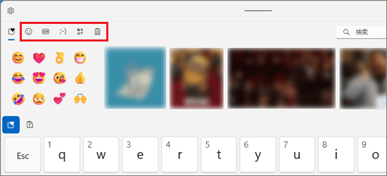 アドバイス- 絵文字パネルの上側にあるアイコンから、「絵文字」、「GIF」、「顔文字」、「記号」、「クリップボードの履歴」を切り替えることができます。