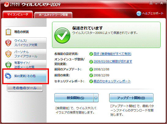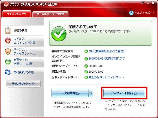 ウイルスバスター2009で、ウイルスやスパイウェアからパソコンを保護するには、ウイルスバスターに最新のプログラムやパターンファイルを適用する必要があります。