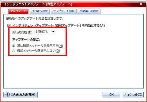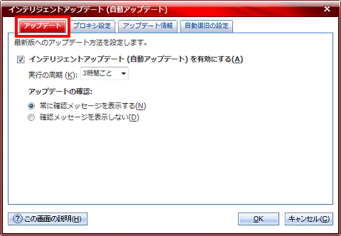 次の手順で、アップデートの設定を確認し、インテリジェントアップデート(自動アップデート)が有効になっていない場合は設定を変更します。