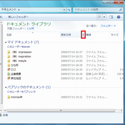 「更新日時」の見出しにマウスポインターを合わせ、右端に表示される「▼」ボタンをクリックします。