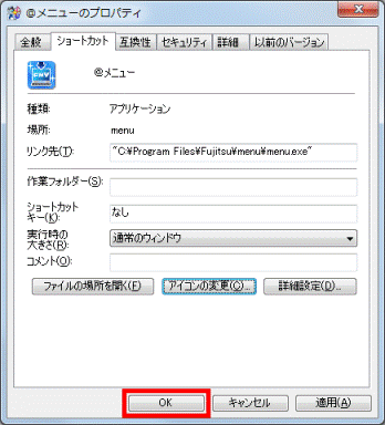 - 「@メニュー」のショートカットアイコンを右クリックし、表示されるメニューから「プロパティ」をクリックします。