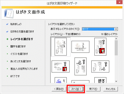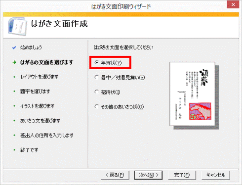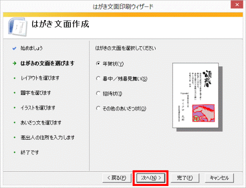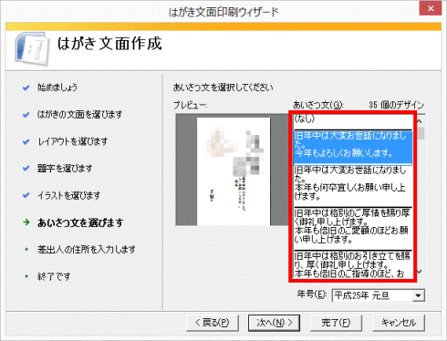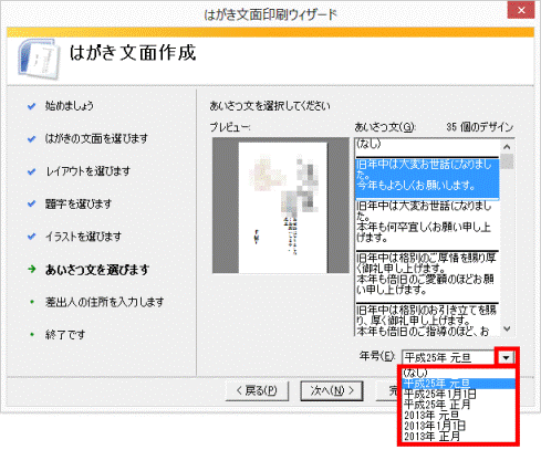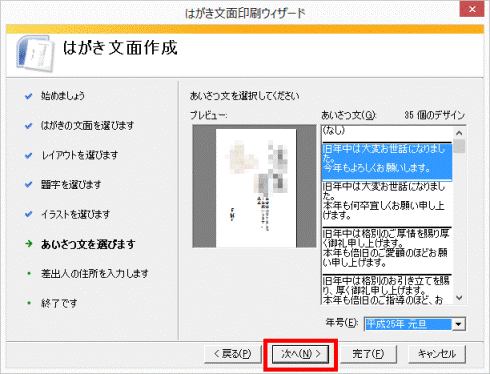 - あいさつ文で使用したい文章と年号の形式を選択したら、「次へ」ボタンをクリックします。