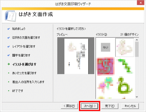 - イラストに使用したいデザインを選択したら、「次へ」ボタンをクリックします。