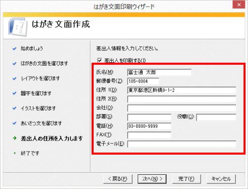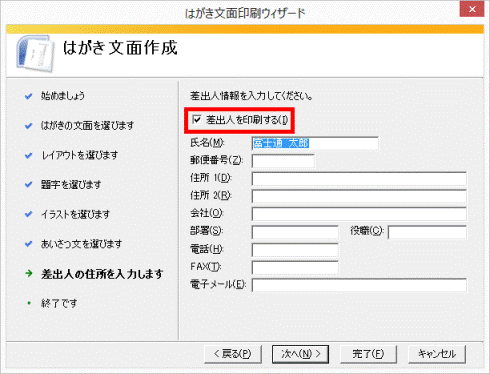 はがきの文面側に差出人を印刷したくない場合は、「差出人を印刷する」のチェックを外します。 - 差出人情報(氏名、郵便番号、住所1、電話番号など)を確認し、印刷したい情報を必要に応じて入力します。